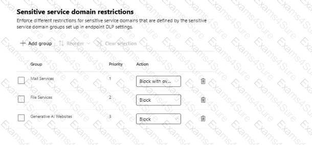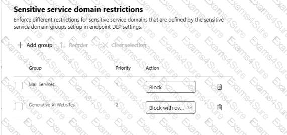 You configure the Upload to a restricted cloud service domain or access from an unallowed browsers settings as shown in the Upload restrictions exhibit. (Click the Upload restrictions tab.)